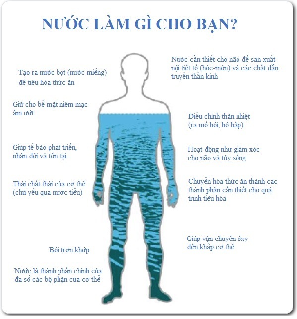 Các quá trình hoạt động bên trong cơ thể, vận động cơ thể và tác động của điều kiện môi trường xung quanh khiến cơ thể bạn mất nước. Bạn cần uống đủ nước sạch hàng ngày để bù đắp số lượng nước mất đi. Người đang trong giai đoạn phát triển cần uống nhiều nước hơn người trưởng thành nếu tính theo tỷ trọng cơ thể.